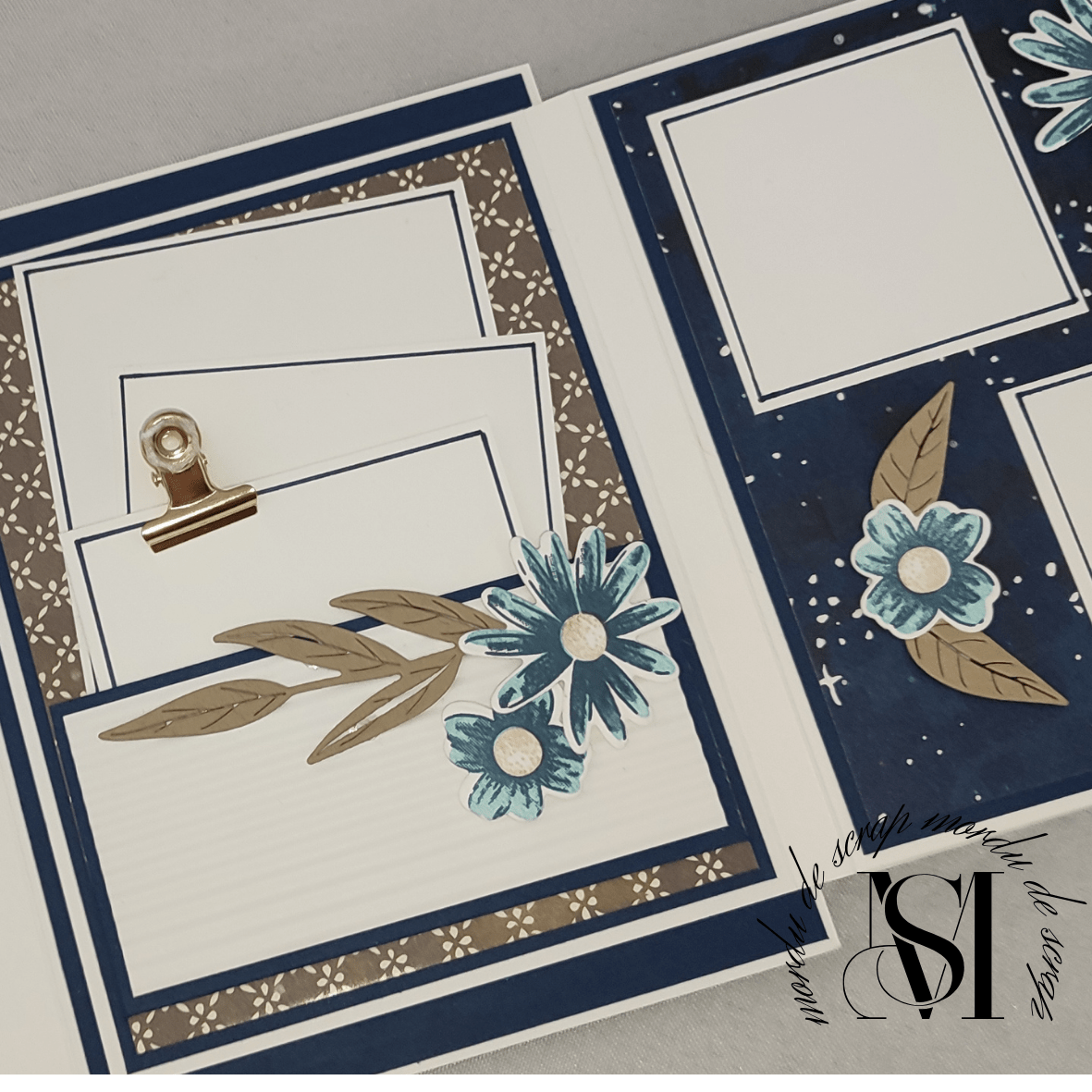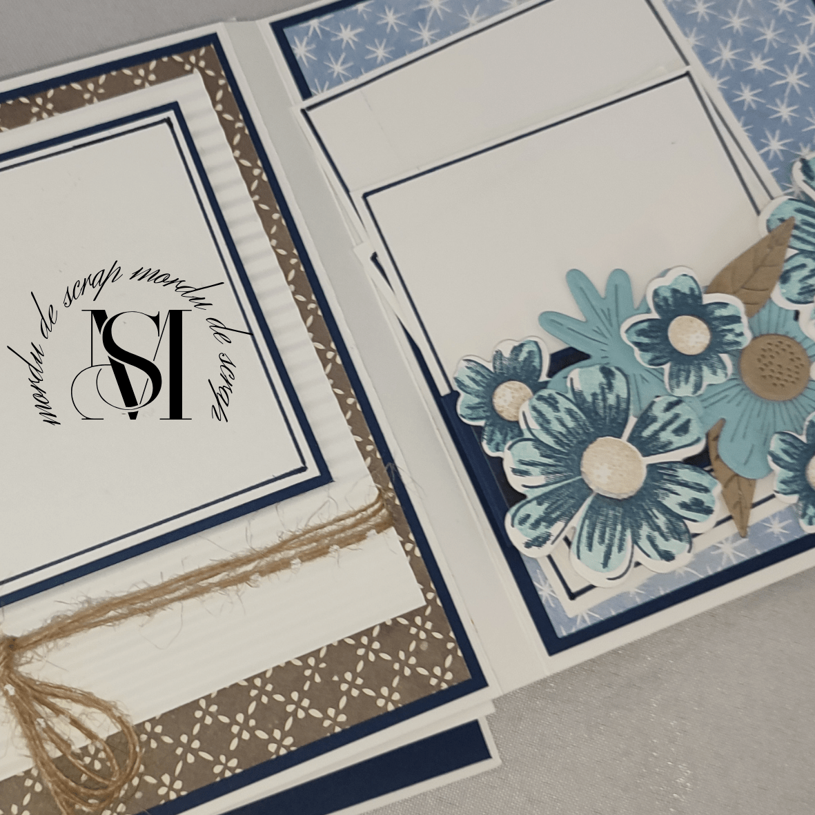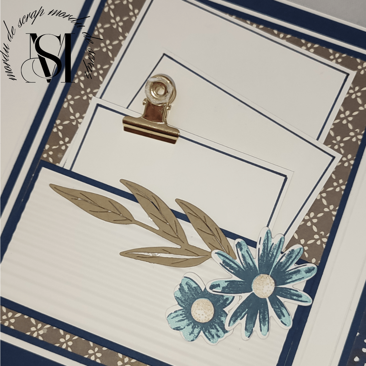 Pour la première version, j’ai utilisé une ancienne collection de papier dans des tons de bleu nuit et béguin bleu. En atelier nous avons utilisé la collection « Bonheur au Quotidien. C’est une série de papiers dans des coloris très doux : Brune Dune, Bien beige, Très Vanille et Lagon lointain.