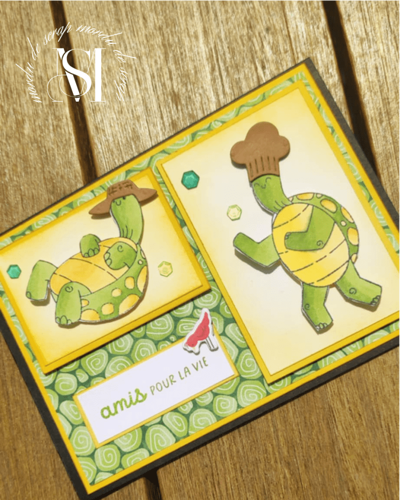 Pour la colorisation, mes petites tortues sont identiques à mon dernier pojet de Slim-Card que tu peux retrouver ICI : Narcisse délice clair/foncé e Grenouille Guillerette clair/foncé.