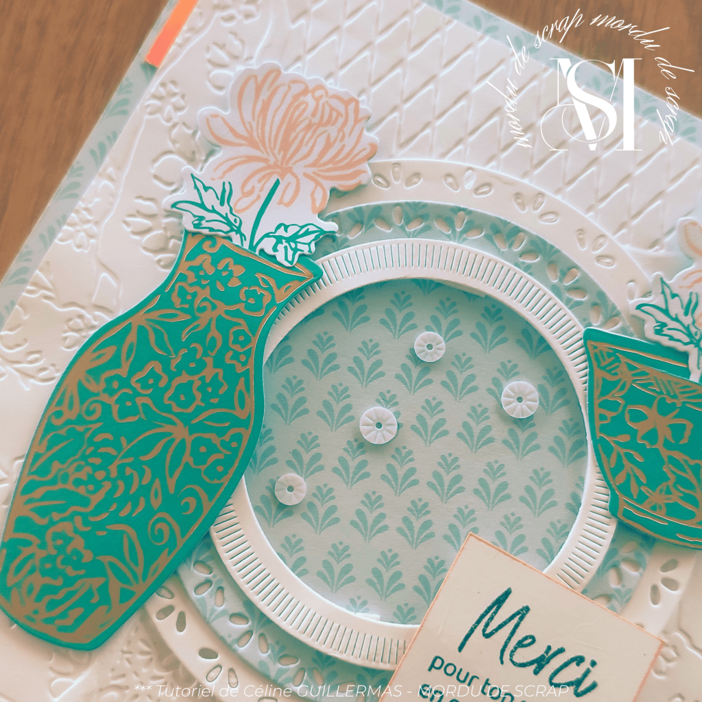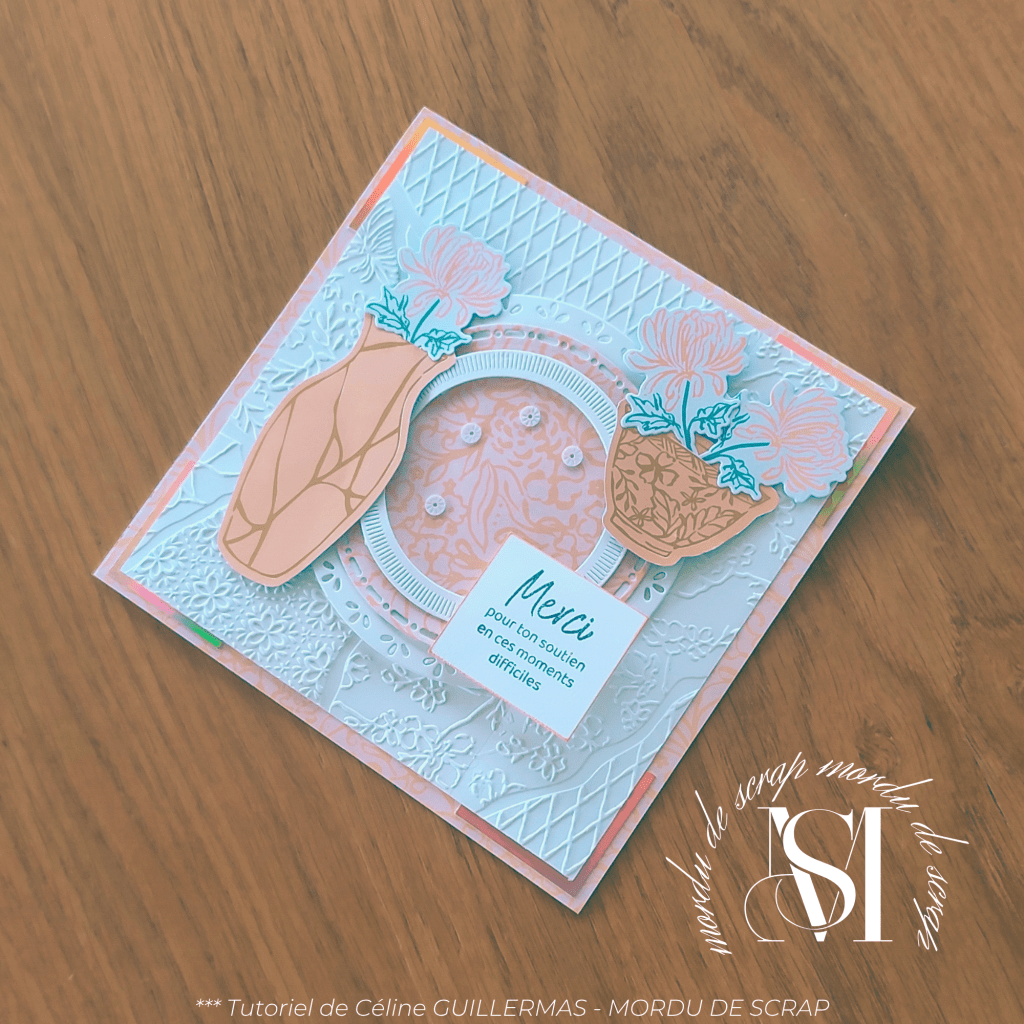 Pour la base de la carte, j’ai utilisé le papier décoratif Inspiration Kintsugi qui est vraiment très inspirant pour ma part. Les couleurs sont très douces et peuvent s’adapter pour toute occasion.
