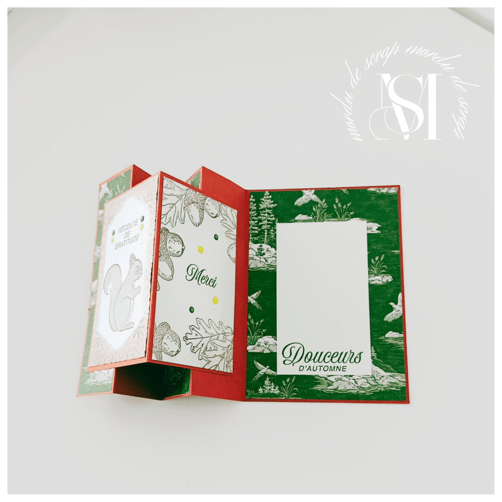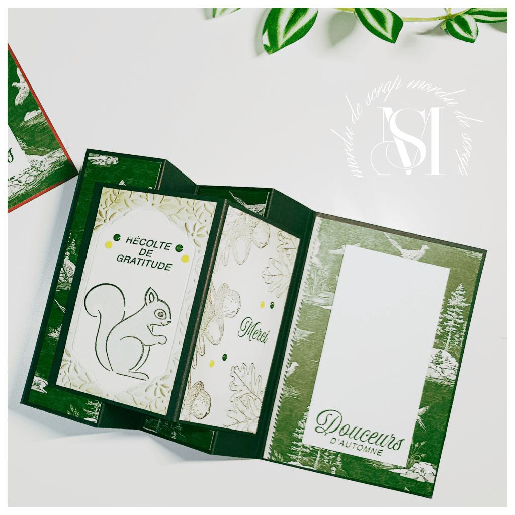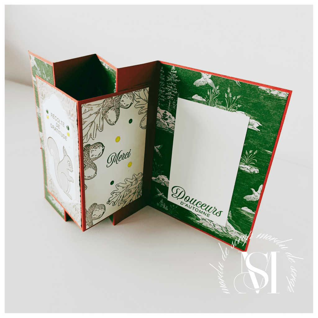 Pour la décoration intérieure, j’ai utilisé les les sets de tampons Automne Ambré et écureuil en fête qui sont parfaits pour des créations automnales.