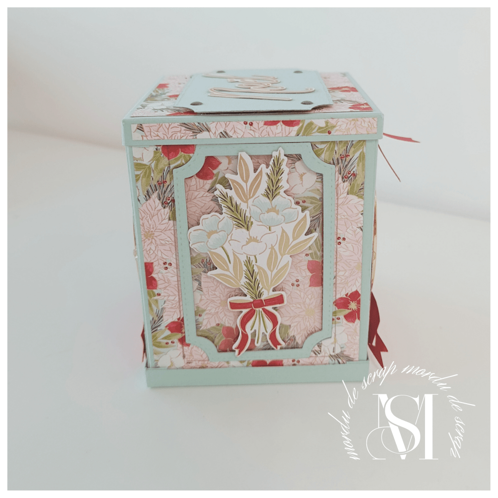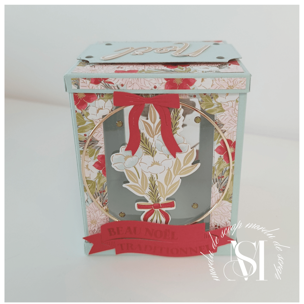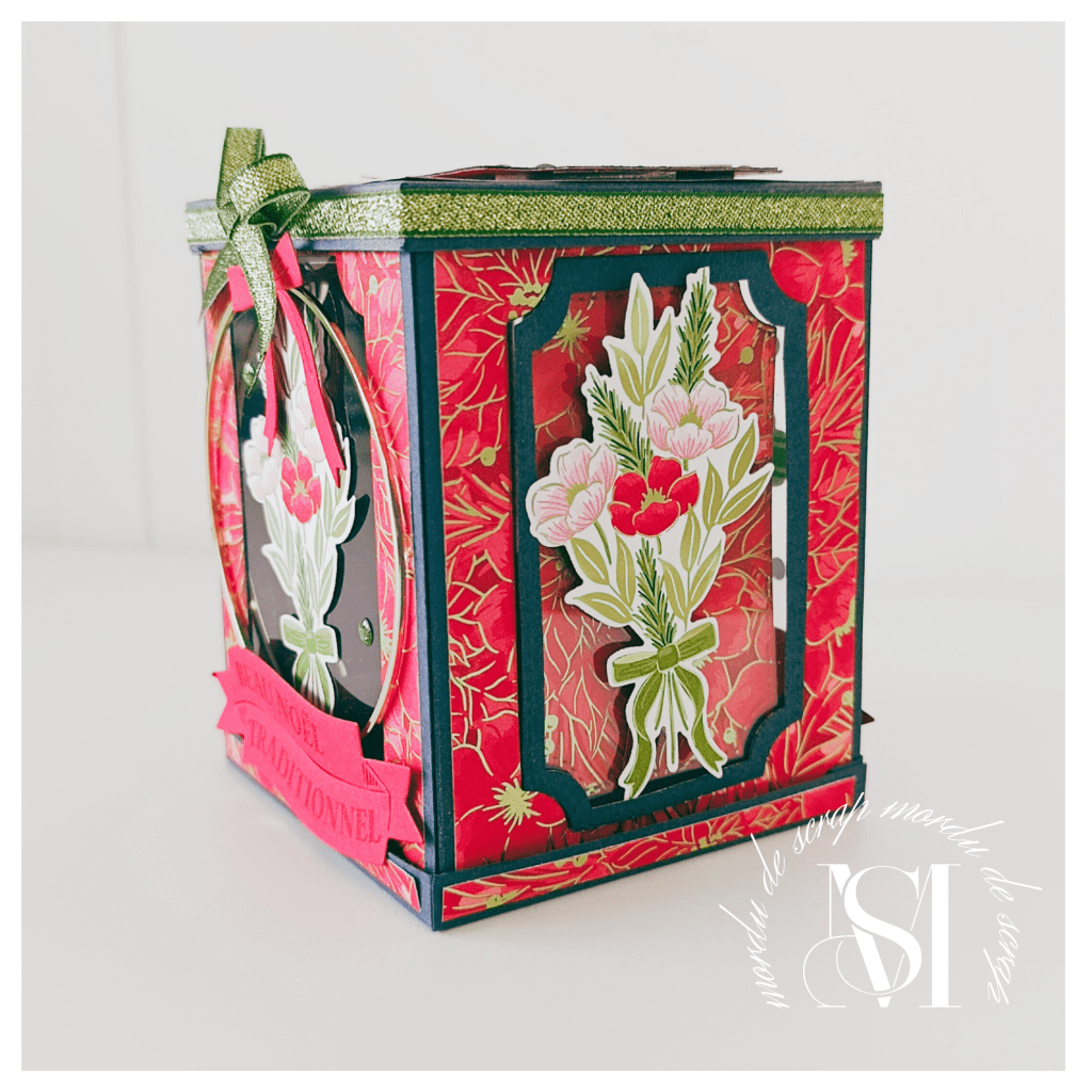 J’ai joué avec l’effet de transparence sur chaque face en utilisant du papier fenêtré ( attention, n’oublies pas que le papier fenêtré ne se colle pas avec de la colle, sinon cela glisse).