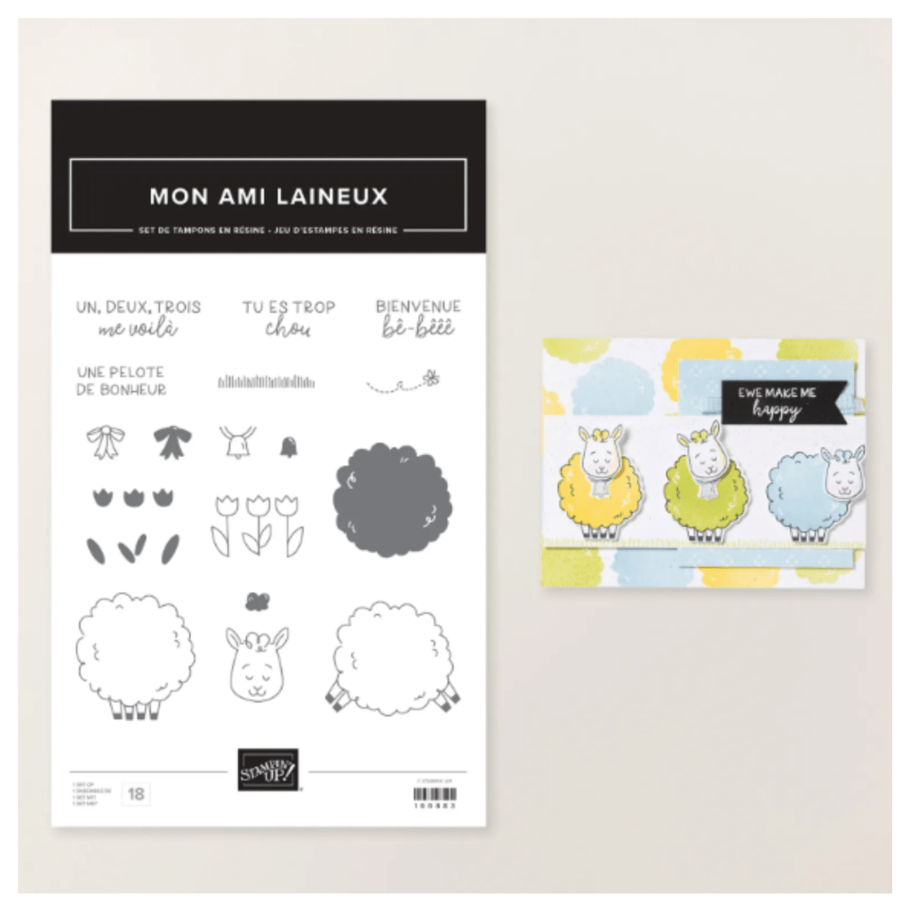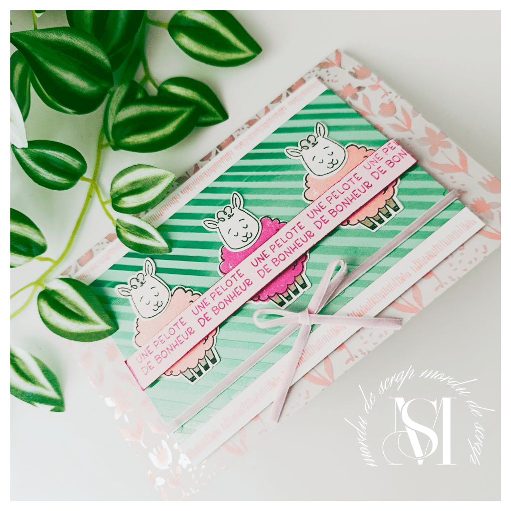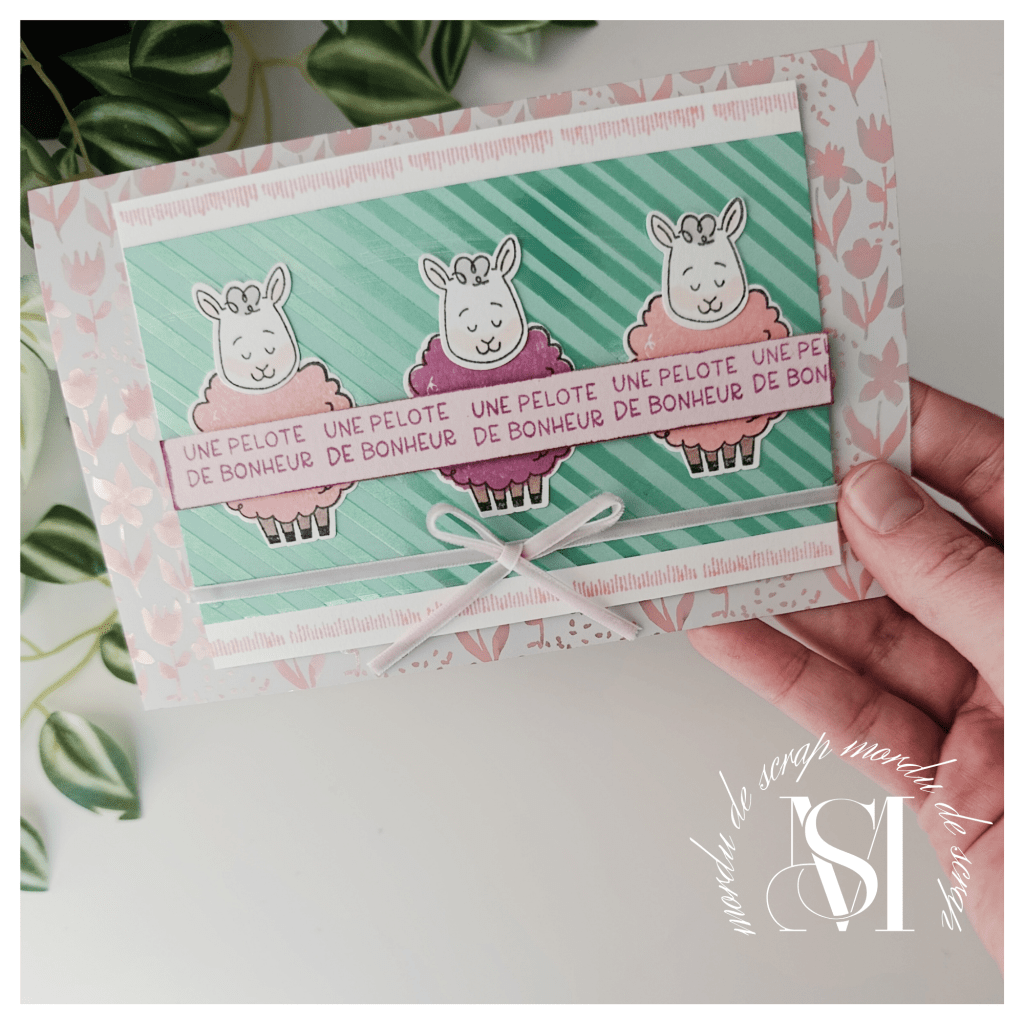 J’ai utilisé le set de tampons Amis Laineux, polyvalent pour des projets variés comme les naissances, anniversaires et Pâques.
