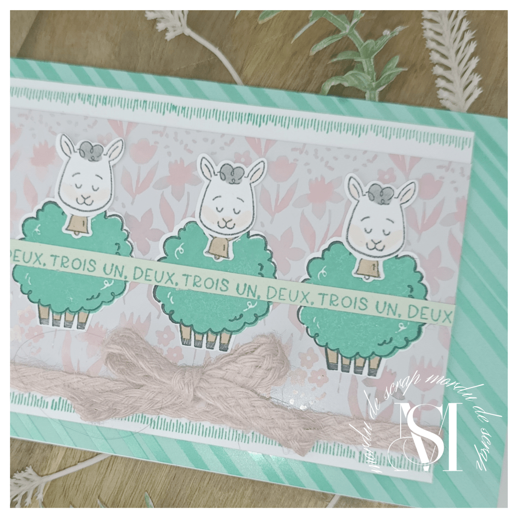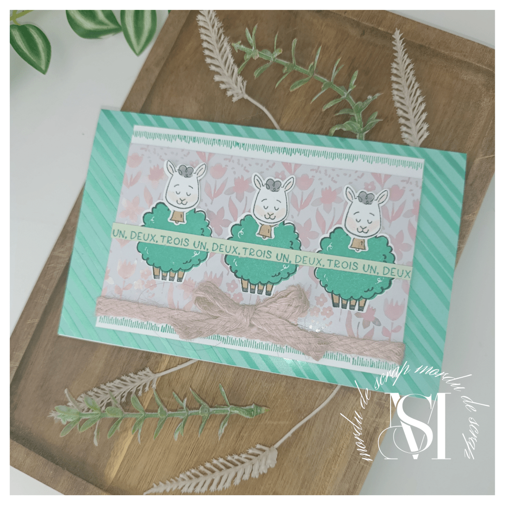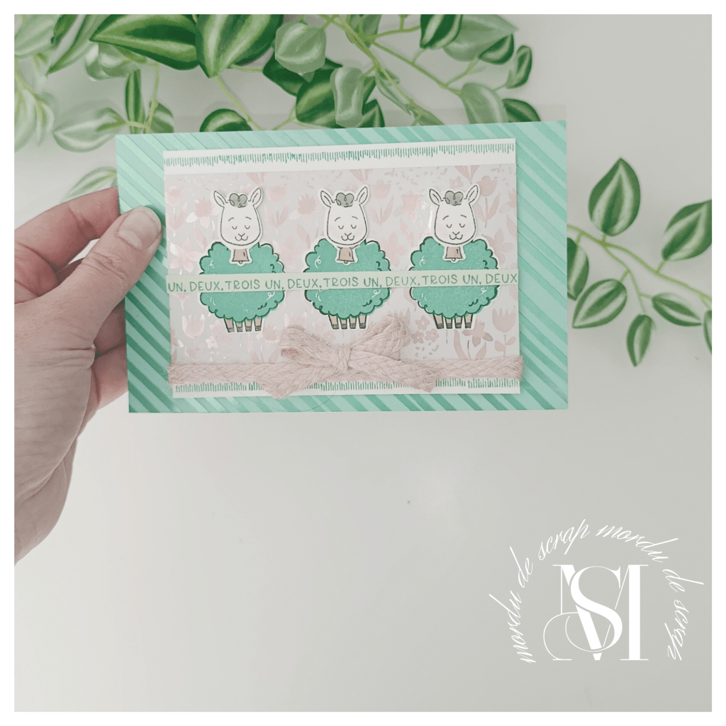 J’ai utilisé le set de tampons Amis Laineux, polyvalent pour des projets variés comme les naissances, anniversaires et Pâques.