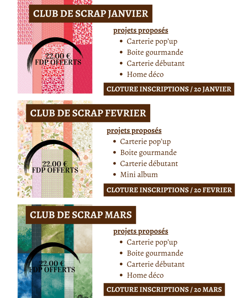 Après de semaines de réflexions, j’ai pris la décision de te proposer d’adhérer au club de scrap. Chaque mois je proposerais une série de créations avec une collection de papiers spécifiques.