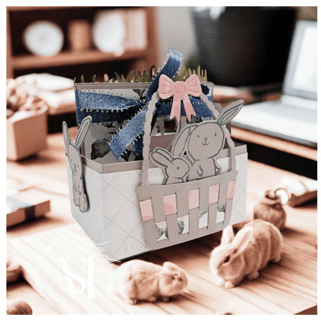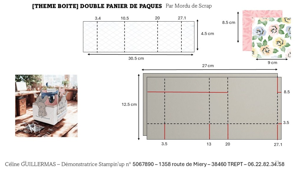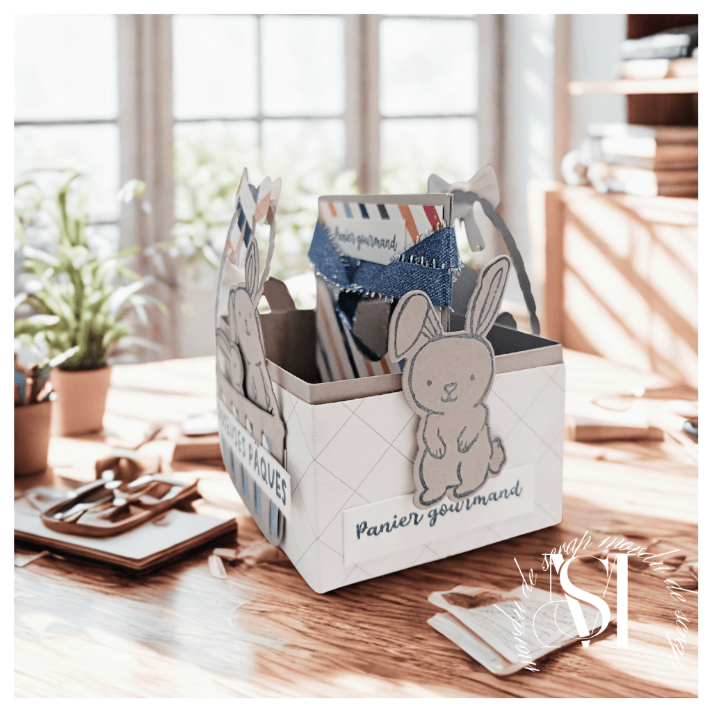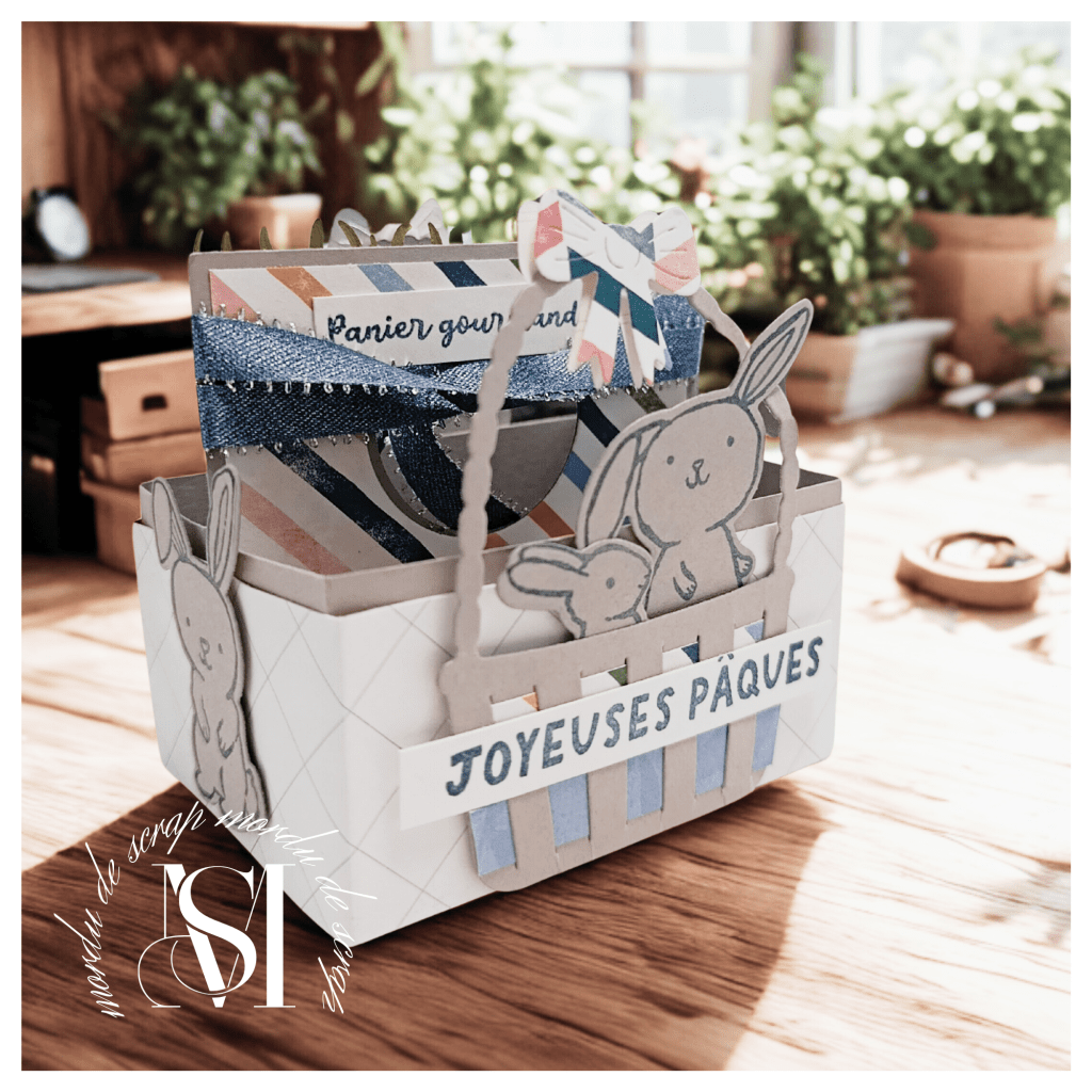 Sur l’avant, j’ai mis en valeur un joli panier « Panier pour Pâques » et la possibilité de faire un tressage avec des bandes de papier, ce qui ajoute une touche d’originalité.