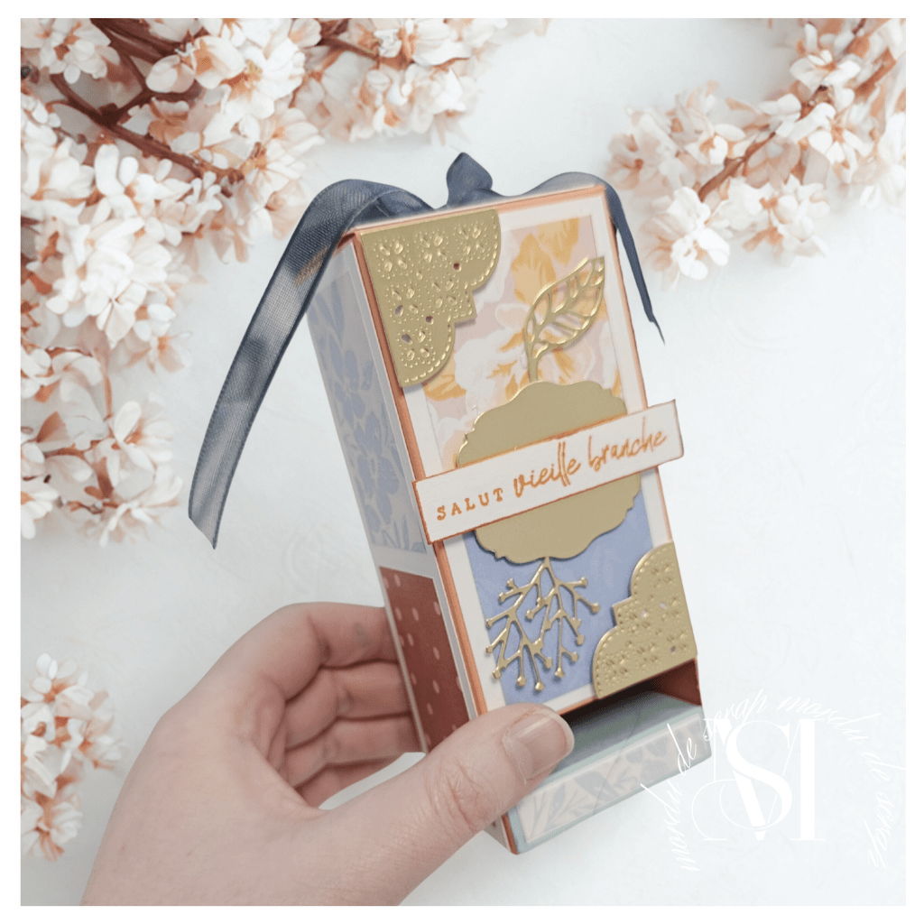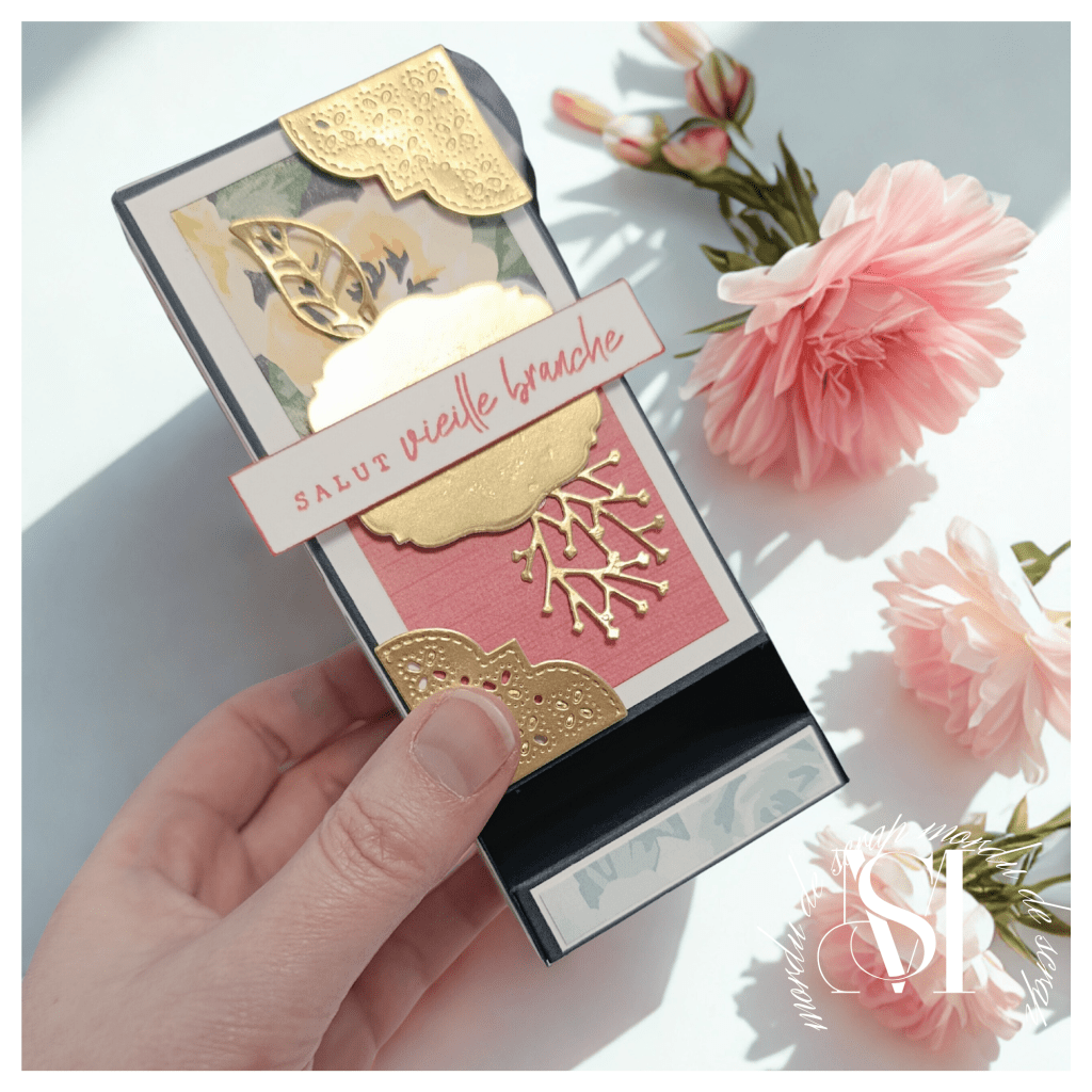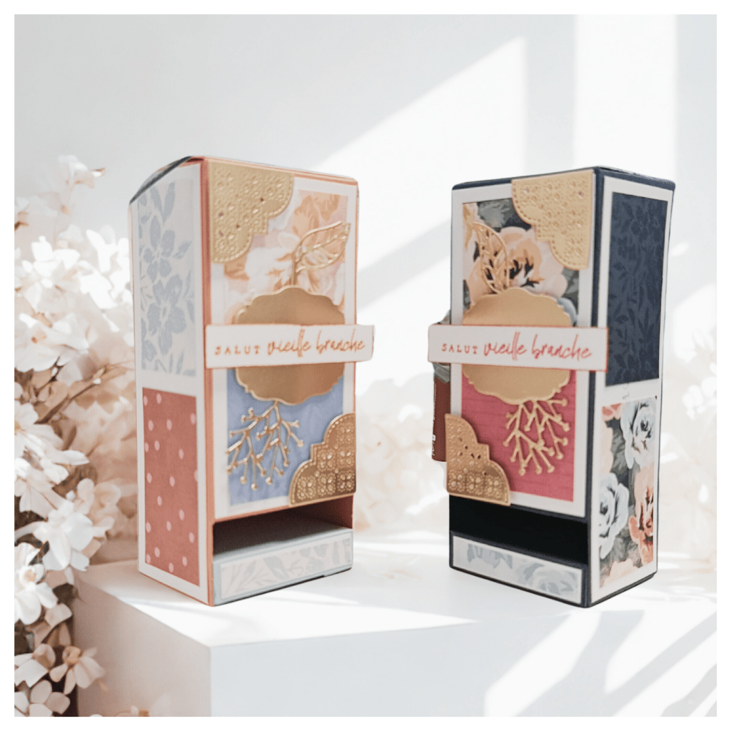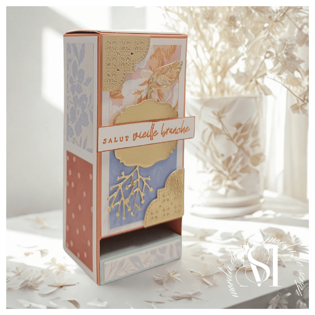 J’ai travaillé avec la collection de papiers « petits bouts carrés » et j’ai agrémenté le tout de petites découpes dorés afin d’ajouté de l’éclat et du raffinement à ce coffret.