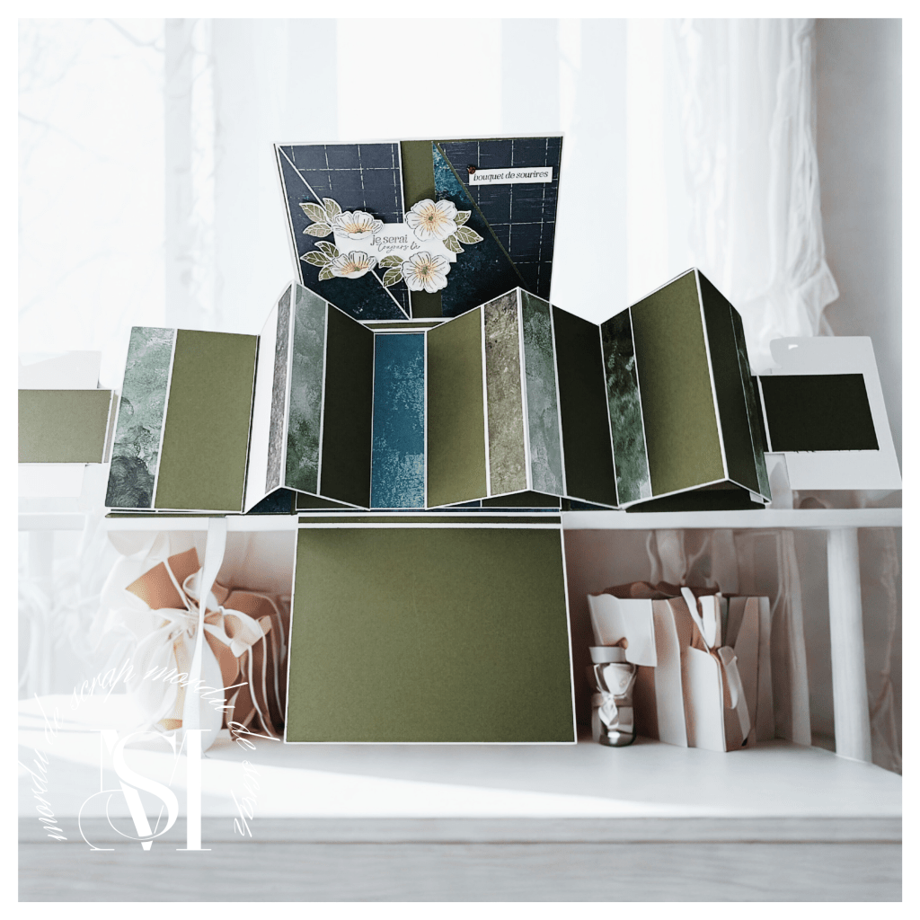 il se compose de 3 partie bien distinctes : la page central contenant plusieurs rabats avec pochettes intégrées, la page de droite et de gauche se composte de plusieurs rabats avec un grand nombre d’emplacements pour des photos ou de la décoration.