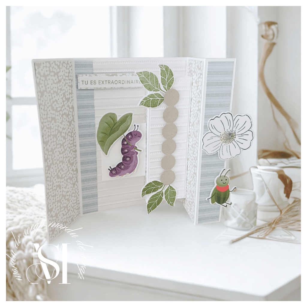 La petite chenille au centre, agrémentée du plioir « Bandes adorables », apporte une touche de douceur supplémentaire que j’aime beaucoup.
