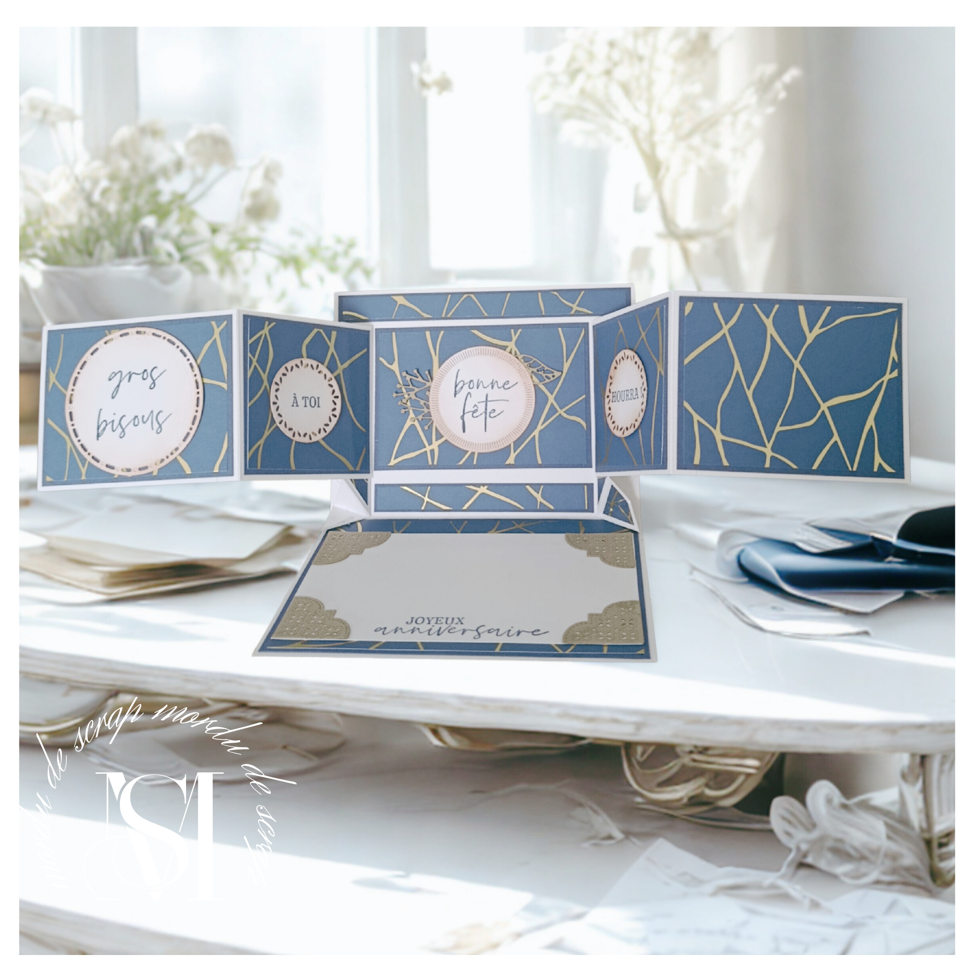Aujourd’hui, je te dévoile une carte flottante à triple panneau. LE PROJET Une création originale construite autour d’un mécanisme aussi simple qu’ingénieux. A l’ouverture, les deux panneaux latéraux se déploient de chaque côté du panneau central, créant une jolie structure en volume. Ce jeu de superposition apporte profondeur et légèreté, donnant l’impression que les éléments … Lire la suite CARTE FLOTTANTE TRIPLE PANNEAU